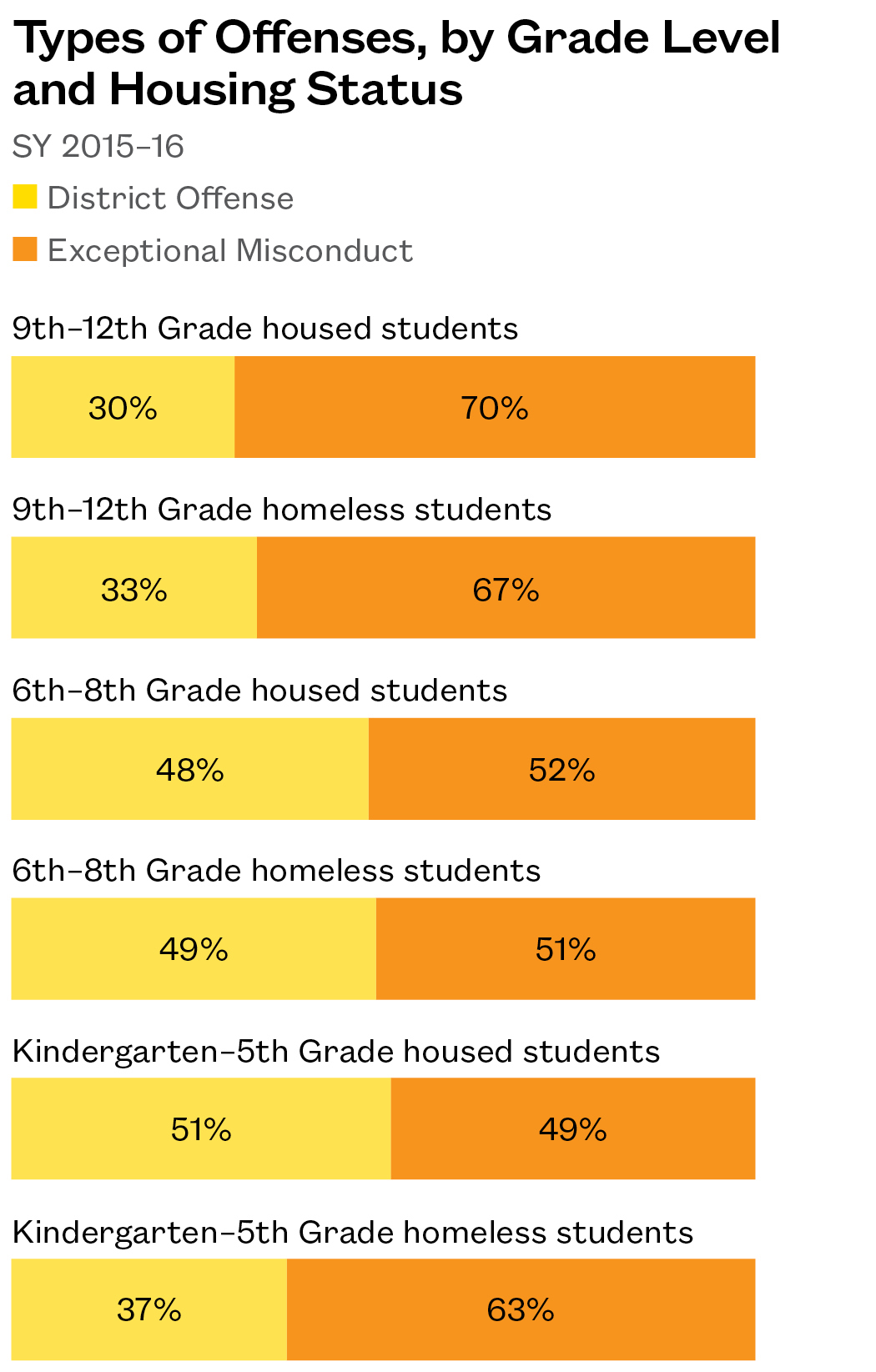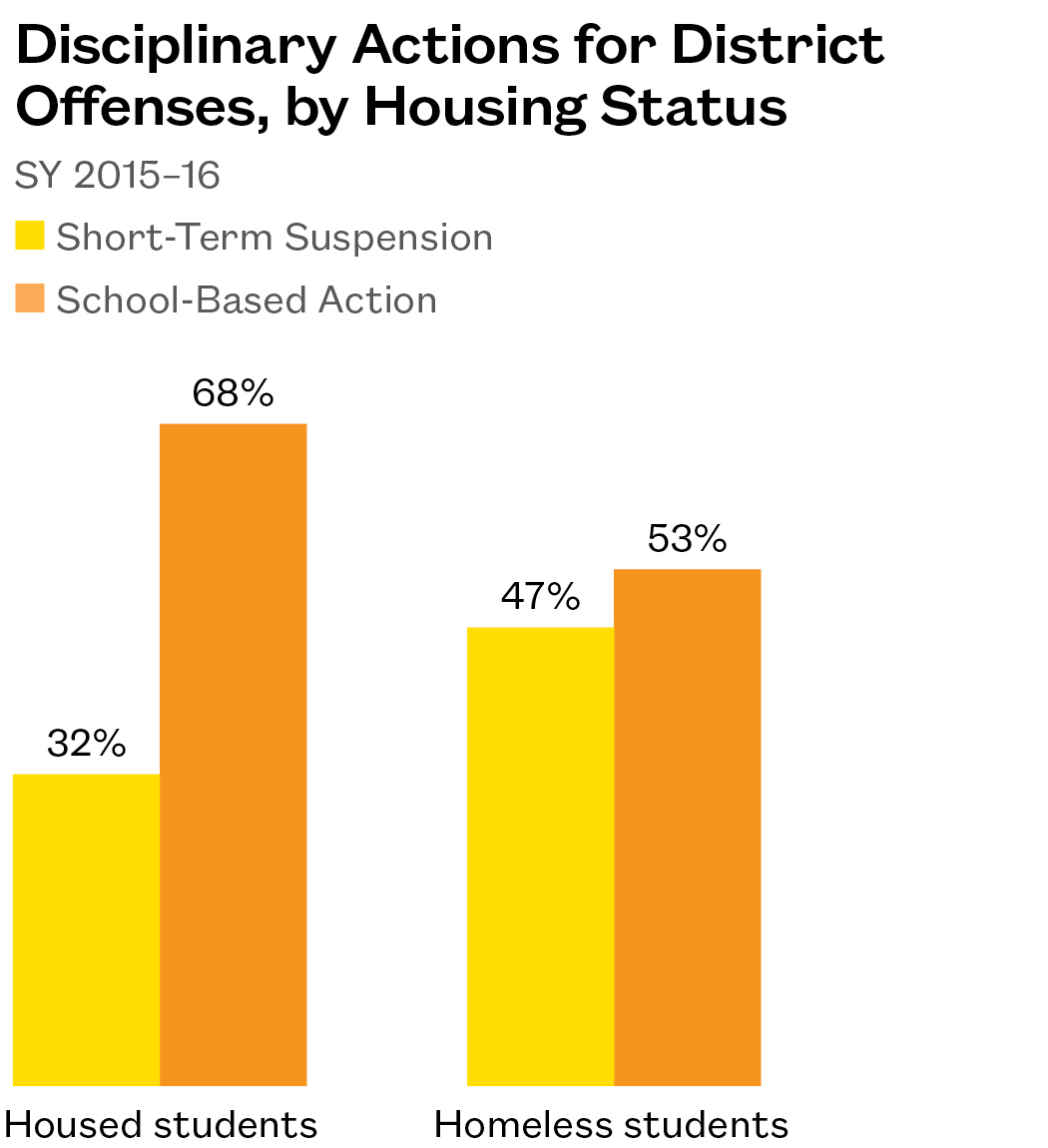 - In SY 2015–16, only 53% of homeless students who were cited for a less severe “District Offense” received a school-based disciplinary action instead of a suspension or expulsion. By contrast, 68% of housed students with a district offense were spared a suspension.
