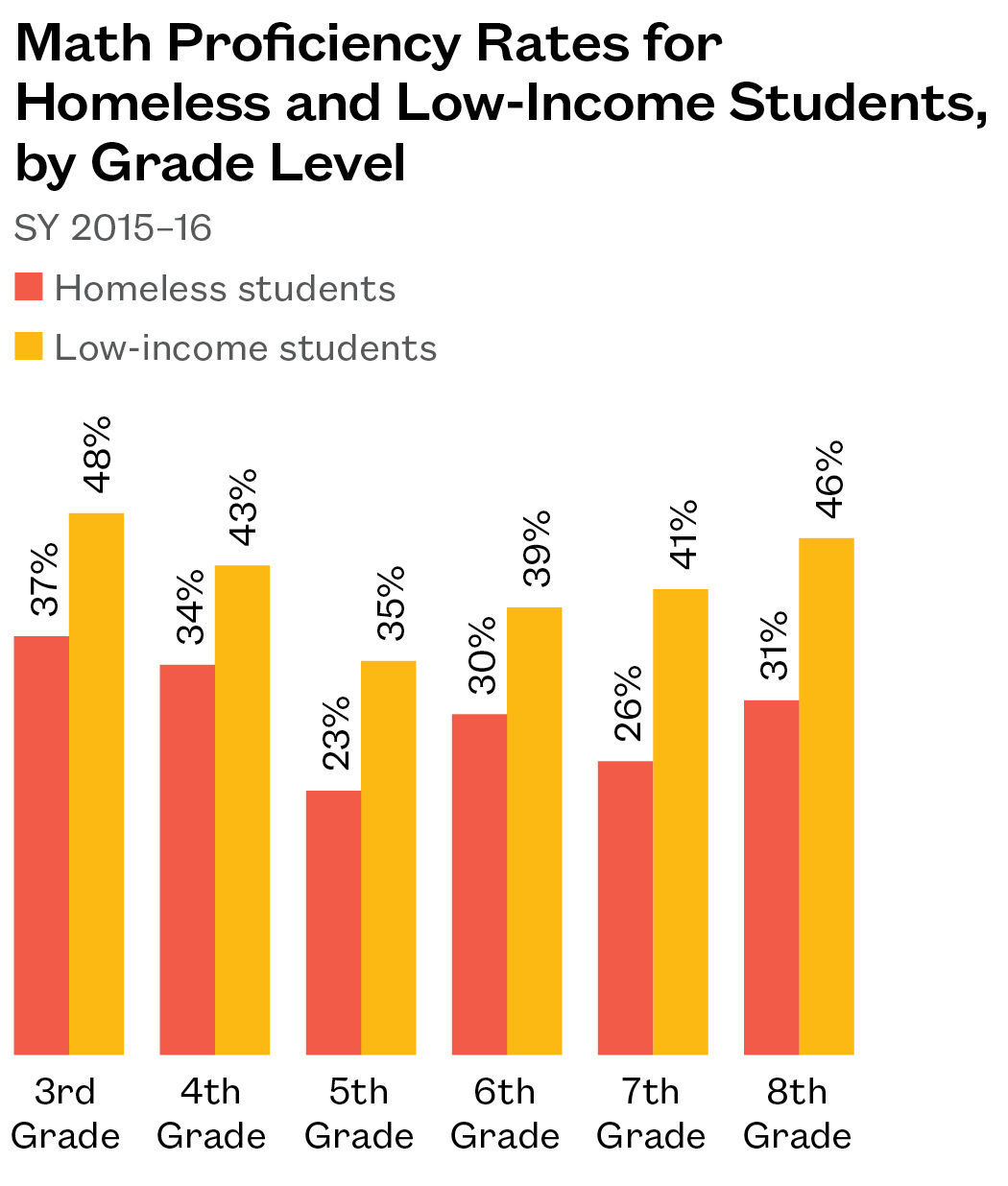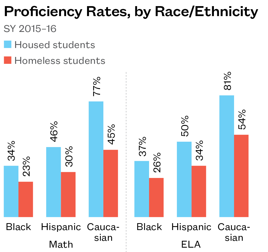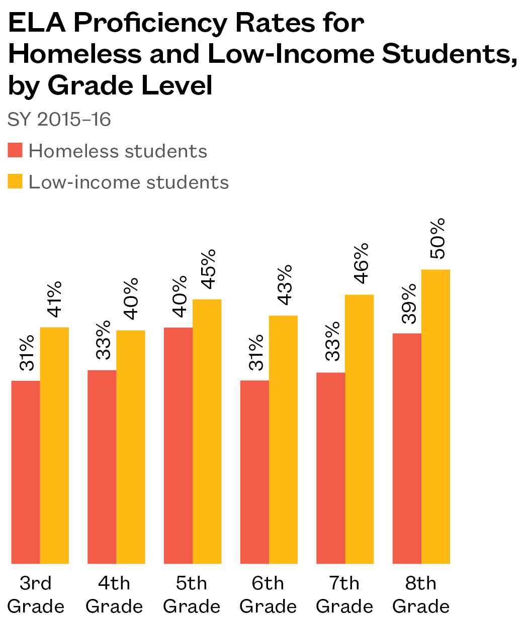 Math and ELA Proficiency Rates for Homeless and Low-Income Students, by Grade Level