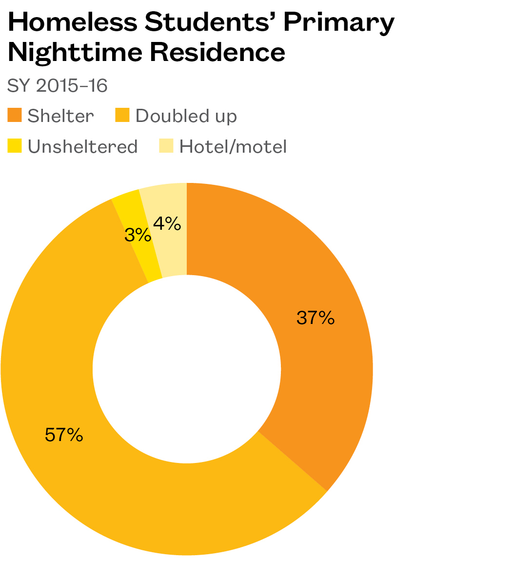 - The majority of homeless students (57%) slept in unstable “doubled-up” living situations. Thirty-seven percent were in a shelter, and ~7% were unsheltered or in a hotel or motel.