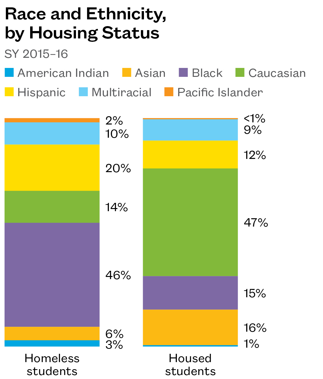 - Twenty-three percent of all Pacific Islander and American Indian students were identified as homeless in SY 2015–16, along with 17% of black and 10% of Hispanic students.