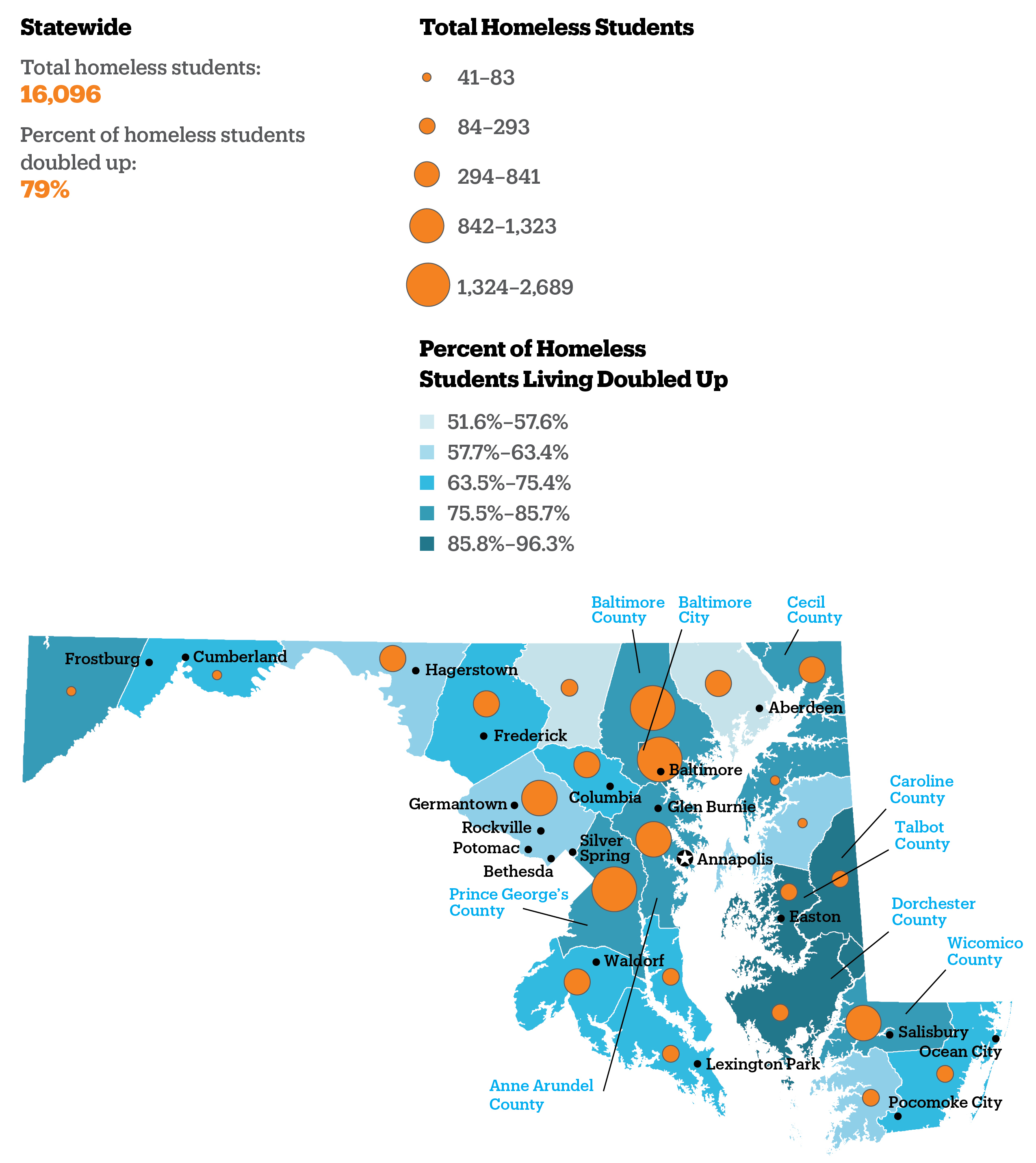 - School districts with the highest rates of student homelessness were Wicomico County (8%) and Cecil County (5%).