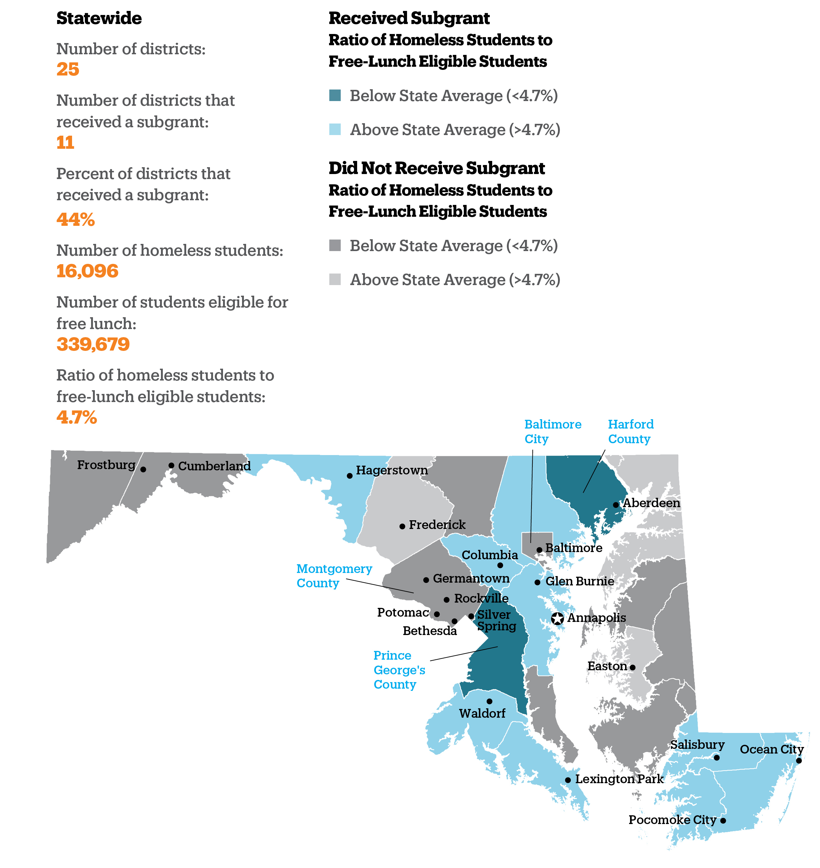 - In Maryland, 48% of school districts had a ratio of homeless students to free-lunch eligible students smaller than the statewide average, including Prince George’s County and Harford County, which received subgrants.