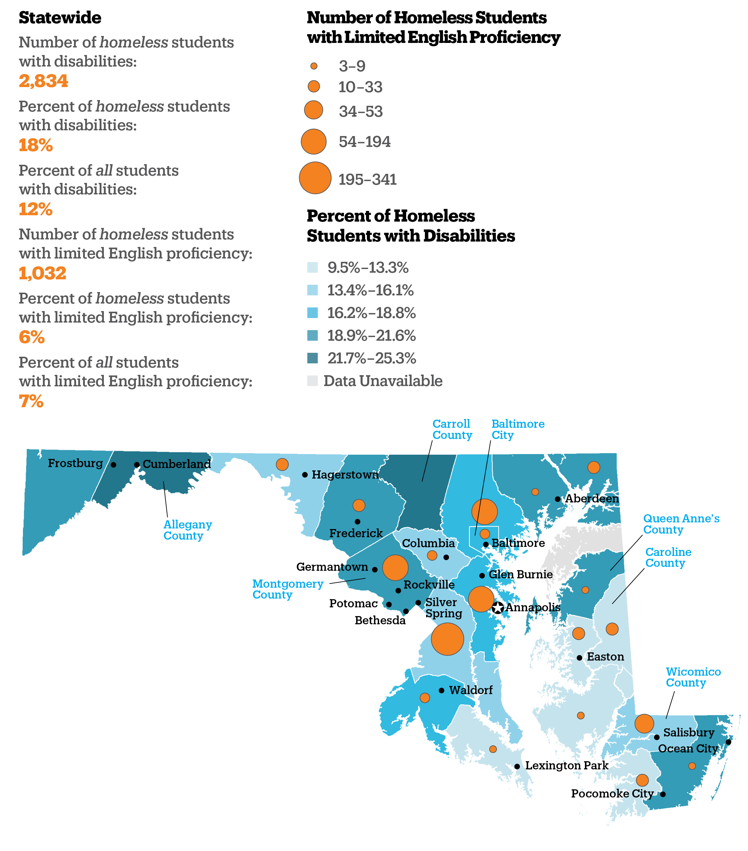 - In three school districts, over 15% of all homeless students had limited English proficiency, over twice the statewide rate for homeless students (Queen Anne’s, Montgomery, and Caroline Counties).