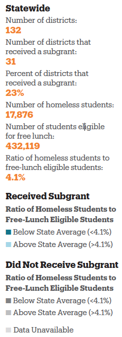 - Twenty-three percent of Virginia’s school districts received McKinney-Vento subgrants, and 78% of the state’s homeless students lived in a district with a subgrant. Non-grantees with the most homeless students included Fauquier and Northampton Counties.