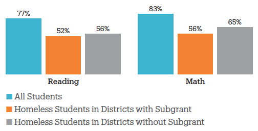 - On average, homeless students were proficient in reading at a rate 21 to 25 percentage points lower than all students. In math, homeless students were proficient at rates 18 to 27 percentage points lower than all students.