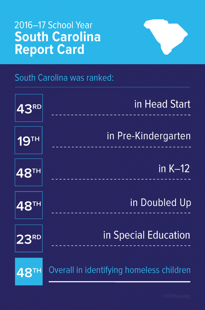 South Carolina identified 11,767 homeless students in SY 2016–17. Homeless students made up 1.5% of total enrollment. The state was ranked 48th overall in identifying homeless students, dropping from SY 2013–14 when South Carolina was ranked 44th in identification.