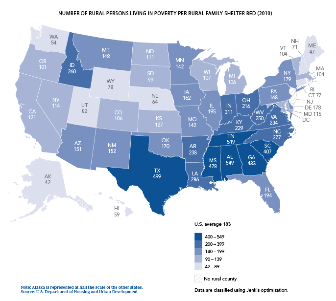 Despite their high rates of poverty and other factors that can destabilize their housing status, rural families have few shelters to turn to for assistance. Despite growing demand, in 2010 there were 183 rural persons in poverty per shelter bed, more than twice the ratio in urban areas (87 to one; see Figure 1). According to 2010 bed-inventory data, a small proportion of family shelter beds are located in rural areas; merely 10.2% of emergency shelter, 10.7% of transitional housing, 7.9% of permanent supportive housing, and 15.6% of Homelessness Prevention and Rapid Re-housing beds were available to rural families experiencing homelessness. Some areas have no shelters; others have minimal bed capacity while serving large regions or assist only specific subpopulations (for example, survivors of domestic violence or those with substance-abuse disorders).