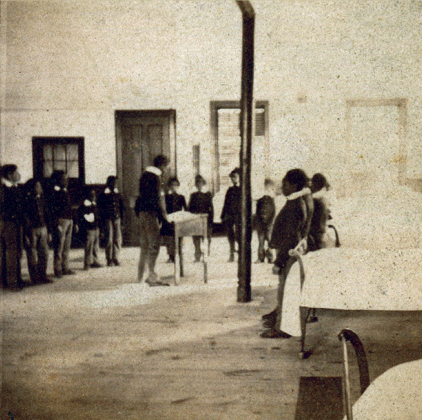 Poverty forced thousands of parents to commit their children to congregate institutions in the nineteenth century. As interest in the emotional well-being of children grew, reformers condemned the often joyless, regimented atmosphere of the institutions. In this image from 1861, children stand in a shared bedroom in New York City’s Colored Orphan Asylum. From the Collection of The New-York Historical Society.