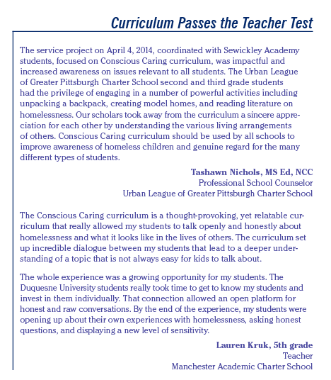 Nykwest, who worked with HCEF for a year before being invited to help with the curriculum development, authored the Conscious Caring curriculum and piloted it at places of worship through the influence of cabinet members. Nykwest first became involved with HCEF as a volunteer reading tutor in the organization’s after-school program, while earning her B.A. in English literature and certificate in children’s literature at the University of Pittsburgh. She has since earned a master of arts and teaching degree, and she gained experience in curriculum design and implementation during an internship at the University of Pittsburgh’s Falk Laboratory School. During nearly two years of adjusting and refining the Conscious Caring curriculum, Nykwest presented it at several Pittsburgh-area schools and worked to train others to teach it. A limited number of copies of the curriculum pilot’s printed version were also distributed to participants at the 2012 National Association for the Education of Homeless Children and Youth (NAEHCY) conference to obtain valuable feedback from educators and others who worked with homeless children and youth. The material generated interest among educators from around the country.