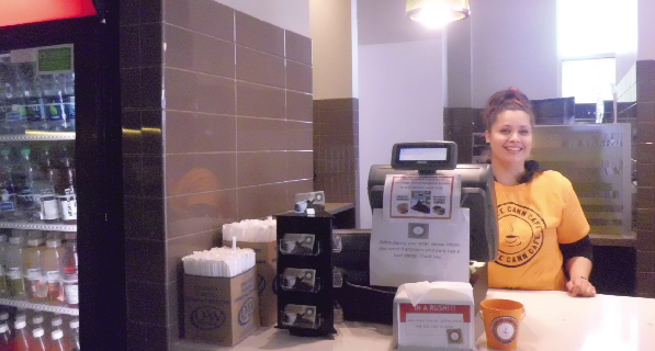 Tiffany works behind the counter at Coffee Cann after completing the COMPASS program, taking a step towards financial independence.