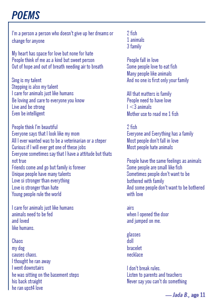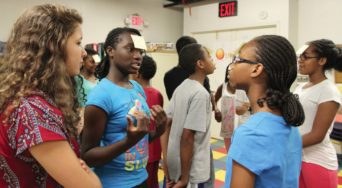 In another activity, students use the five senses to describe where they are from. One girl who has been quiet up until now brightens up and offers to read her poem, beginning: “In my Africa, we dance.” The instructors’ faces light up, and the other children actively listen. When the poem is over, the other members of the group take turns giving positive feedback. The young girl, who seemed down at the start of the day, now appears engaged and excited to continue working on her poem.