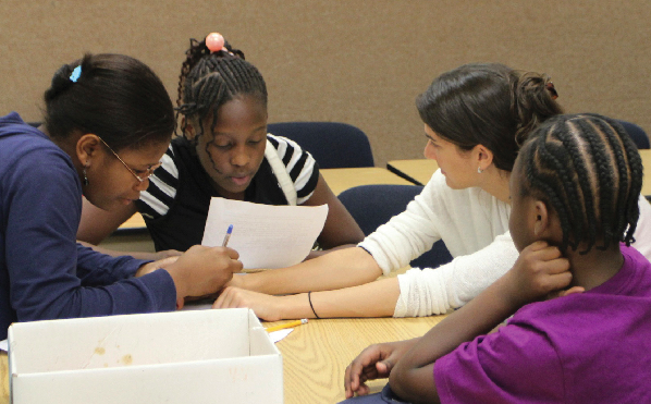One ten-year-old girl sits at a table surrounded by her peers, answering their questions from the perspective of Chrissie, a character she created. Her answers get her thinking about what to include in her short story to develop her character further.