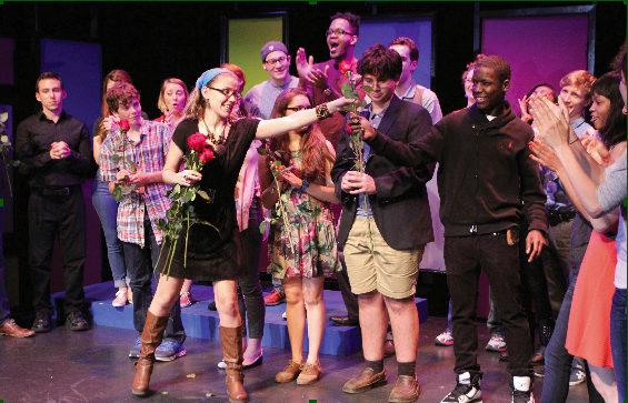 Sharm, a Writopia student who joined the program while living at a treatment facility for incarcerated youth, receives a rose after watching his play performed on stage to much laughter and applause.