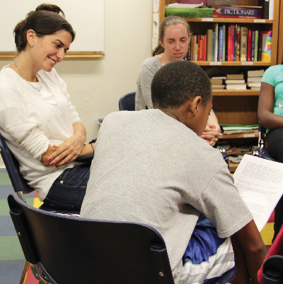 One student reads her latest short story aloud while another listens closely, taking notes to share her comments with the writer once she has finished reading.
