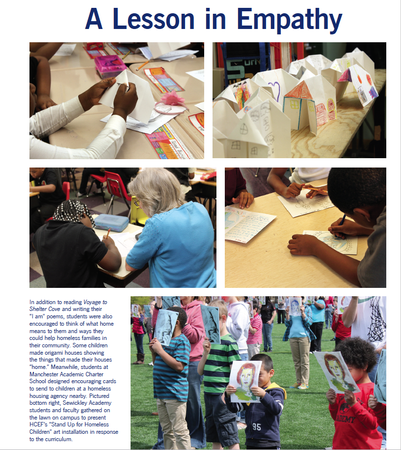 In addition to reading Voyage to Shelter Cove and writing their “I am” poems, students were also encouraged to think of what home means to them and ways they could help homeless families in their community. Some children made origami houses showing the things that made their houses “home.” Meanwhile, students at Manchester Academic Charter School designed encouraging cards to send to children at a homeless housing agency nearby. Pictured bottom right, Sewickley Academy students and faculty gathered on the lawn on campus to present HCEF’s “Stand Up for Homeless Children” art installation in response to the curriculum.
