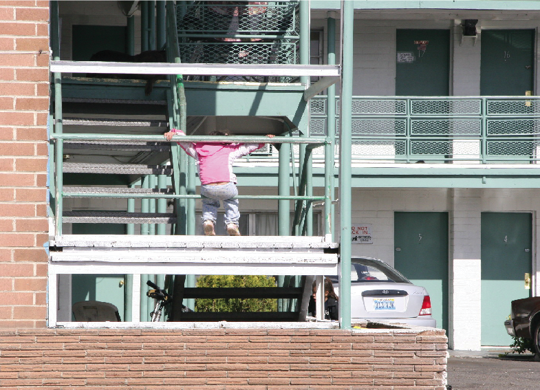 Reno, NV: Driving down one of the seedier streets of this city, I spotted this motel and kids playing in the parking lot and in the open hallways. Knowing that families often turn to motels as an escape from life on the streets (at the time in 2009, Reno had no family shelter), I pondered life as a child using motel railings as playground equipment.