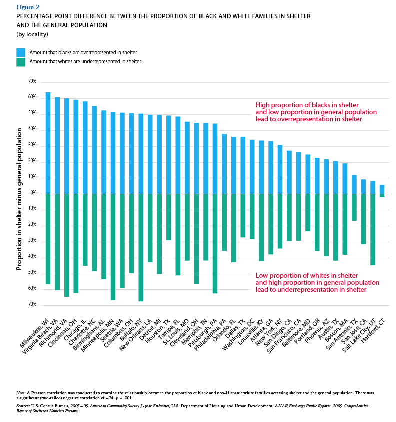 To explore a more detailed relationship between race and homelessness, data were examined for white and black homeless families in cities across the country. Fiscal Year 2009 data were available for 37 out of the 50 largest metropolitan areas. An analysis of the data showed that the extent to which black families were overrepresented in homelessness shelters compared to the general population was nearly equivalent to the underrepresentation of white households in shelter. For example, in New York City and St. Louis, roughly twice as many black families are found in shelters (55.9% and 95.0%, respectively) compared to their share of the general city population (25.2%, versus 49.5%). The opposite holds true for white families, who are vastly underrepresented in local shelters (1.9% and 3.0%, respectively), given the percentages of white families residing in New York City and St. Louis overall (36.1%, versus 44.7% [figures 1 and 2]). While the magnitude of the racial disparity varies by locality, the overall strength of this negative correlation demonstrates that racial disparities still affect homeless families today.