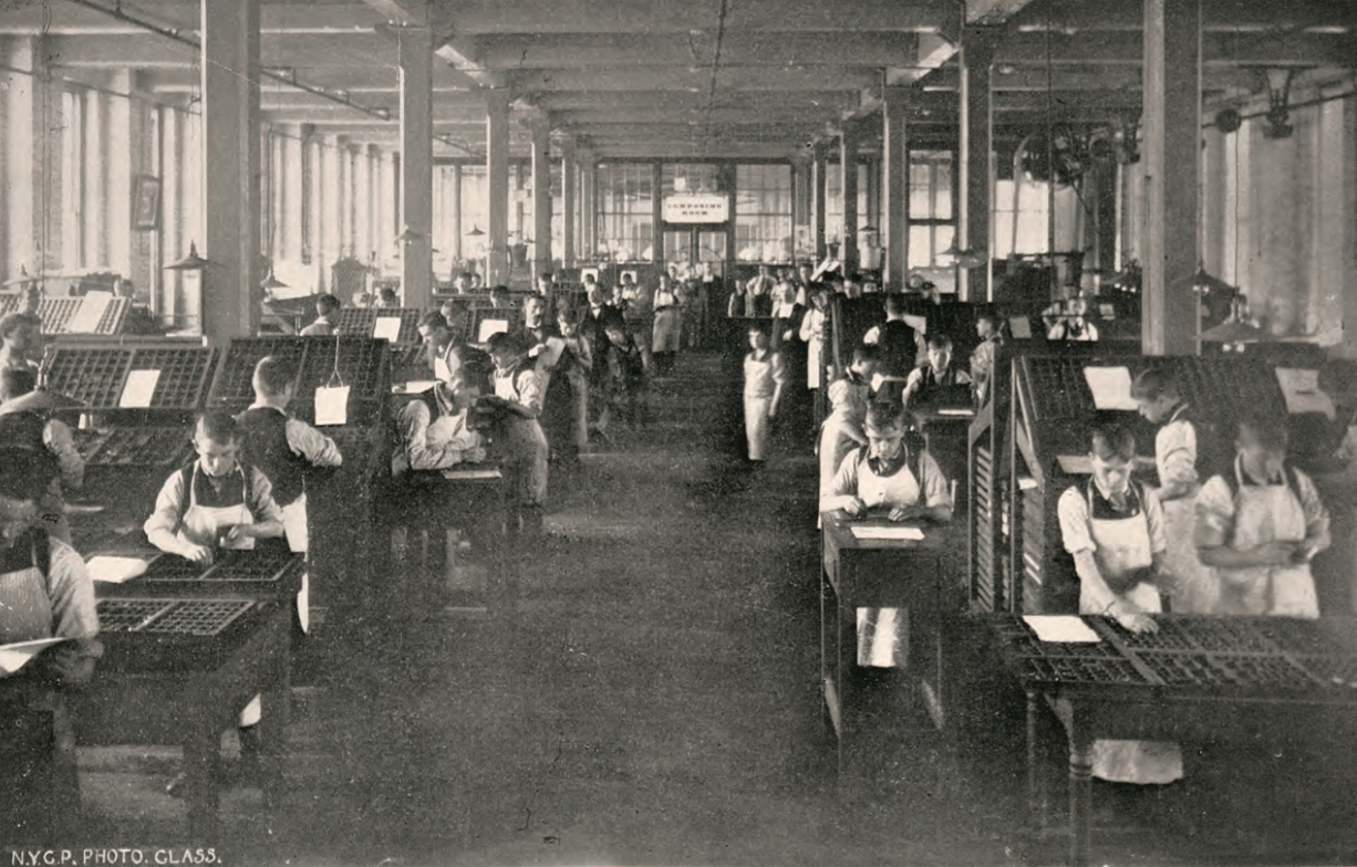 Composition room at the Catholic Protectory. At most institutions for children, residents learned trades that could support them in adult life. In this photo, from 1898, boys compose type for printing. Collection of the New-York Historical Society.
