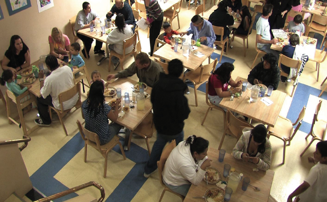 At the main shelter, all family members must leave the facility during the day—for work, job searches, or school—then return at 5 p.m. or so. Passes are issued in the evening for events such as religious services, substance-abuse recovery meetings, or job interviews, but otherwise clients are required to eat dinner at the shelter and remain there through the night.
