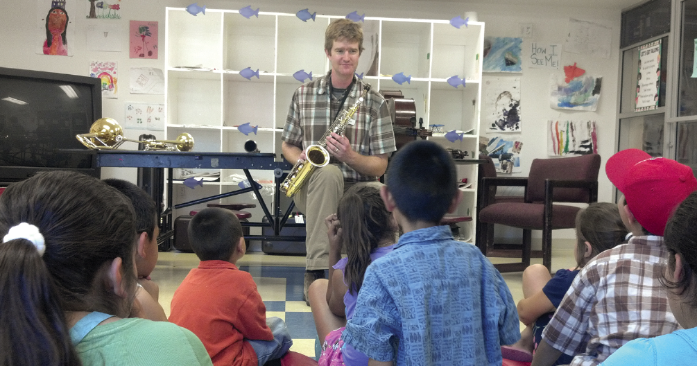 A local musician visits with Transition House children during evening enrichment to teach them about different musical instruments.