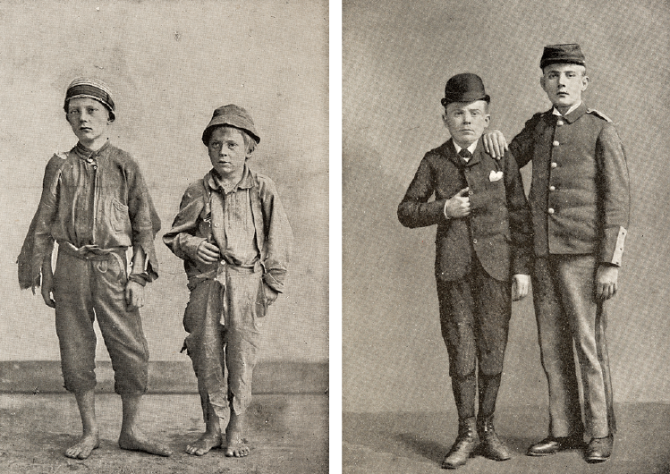 Two brothers, before and after their five-year residence in the Catholic Protectory. Institutions tried to produce adults whose appearance, work habits, and religious views and practices reflected middle-class ideals. The Protectory used these images as proof of its success in its 1892 annual report. Collection of the New-York Historical Society.