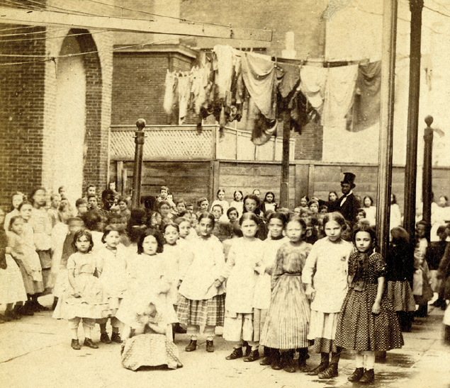 Residents in the courtyard of the Home for the Friendless, c. 1864. Established by the American Female Guardian Society, the home provided housing and job training to the “unprotected female whose only crime is poverty and the need of employment.” Collection of the New-York Historical Society.