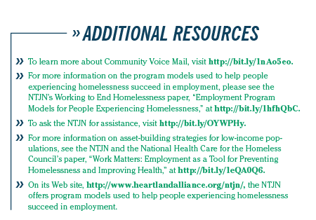 By providing the basic tools for conducting a job search on-site, providers can lower the barriers to beginning to look for a job. For example, Internet-connected computers and telephones can facilitate self-directed job-search activities. “We have 16 computers where clients can conduct an online job search and check e-mail,” says Yohe. Also, setting up dedicated phone lines or connecting clients to Community Voice Mail—a service that gives participants private, ten-digit phone numbers that go to personalized voice mail boxes where they can receive messages—provide ways for prospective employers to respond to applications without revealing that applicants are staying in shelters or supportive housing.