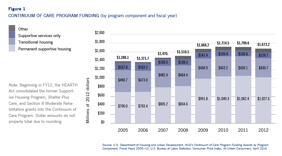 U.S. Department of Housing and Urban Development, Notice of Funding Availability (NOFA) for the Continuum of Care Program, Fiscal Years 2005–13 ■ U.S. Department of Housing and Urban Development, HUD’s CoC Homeless Assistance Programs—Homeless Populations and Subpopulations, 2007–13; U.S. Department of Housing and Urban Development, Annual Homeless Assessment Reports to Congress, 2010–12.