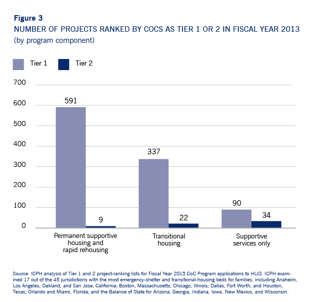In FY12 HUD began to intensify these efforts and announced that new permanent supportive-housing and rapid-rehousing projects would be funded before new transitional housing and programs that provide supportive services only. Communities were also required to rank existing projects in order of importance, dividing them into two tiers. The higher-priority Tier 1 projects were expected to be funded based on initial grant estimates from HUD, and the lower-priority, or Tier 2, projects were to be funded only if additional money was available, to be awarded first to the highest-scoring CoCs. This ranking system was employed in FY13 as well, but HUD stated that permanent supportive housing or rapid rehousing programs (collectively referred to as “permanent housing”) would be the only new projects funded.