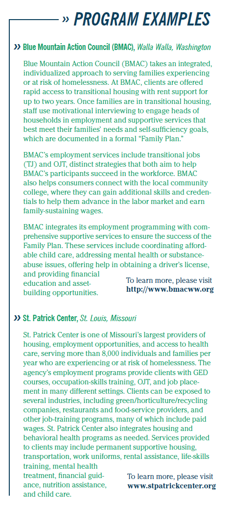 Finally, while employment is a critical initial component of helping families transition out of homelessness, asset building establishes a “personal safety net” so that a family remains stably housed even in the face of future unanticipated expenses or job loss. Providers can incorporate asset-building strategies into their employment programming. “We absolutely do asset building at BMAC,” says Goodwin. “We offer MoneySmart classes, and our participants can come in to make one-on-one appointments to learn financial management skills.” Financial education can help connect heads of households to safe and affordable financial products such as low- or no-cost checking accounts; educate them about predatory lending and credit card costs; and teach practical skills, such as budgeting and balancing a checkbook. Homeless-service providers can also help customers claim tax credits such as the EITC and the Child Tax Credit (CTC) by connecting heads of households to Volunteer Income Tax Assistance (VITA) sites, where qualified low-income individuals can receive free tax preparation and filing. For organizations with the resources to offer robust asset-building programming, developing a match-savings program encourages saving and increases assets to help families meet realistic financial goals—such as paying a first month’s rent or reducing debt—and lay the foundation for long-term stability.