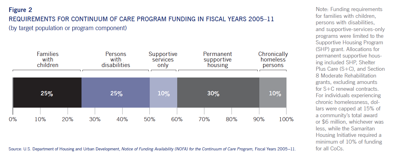 In FY05–11 HUD was required, per the McKinney-Vento Homeless Assistance Act (McKinney-Vento), to dedicate a percentage of funds to specific populations. After applications were scored, certain projects were selected—even if they were a lower local priority—in order to meet these minimum thresholds. Overriding HUD’s own policy priorities, at least 25% of funding had to be spent on services for families. Given the lack of incentives for communities to prioritize families in their applications, this McKinney-Vento provision was the only way services were ensured for families over this time period. While McKinney-Vento stipulated that 25% of monies were also set aside for persons with disabilities and 10% for supportive-service programs, Congress added the requirement that 30% of funds be allocated for permanent supportive housing through its annual appropriations acts (see Figure 2). In addition, the Permanent Housing Bonus (officially known as the Samaritan Housing Initiative in FY05–07) awarded approximately 10% of funds to serve chronically homeless persons or those with disabilities. These funding requirements inherently disadvantaged homeless families; families represent roughly 35% of all homeless persons but received only 25% of CoC Program funding, highlighting a tension between local need and federal funding priorities.