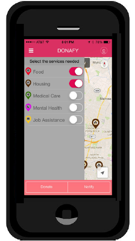 Another app that connects people in need with services is DONAFY. Created by Nikki Johnson-Huston, a successful tax attorney in Philadelphia who experienced homelessness as a child, the free app offers three main services: it helps those in need locate nearby services, allowing them to map directions from their location or to search organizations within the app; it allows citizens to locate and donate to nearby nonprofit organizations that serve people in need of housing, food, medical care, mental health counseling, job training, LGBT services, and legal services; and it provides citizens with the opportunity to notify an organization that someone nearby is in need.