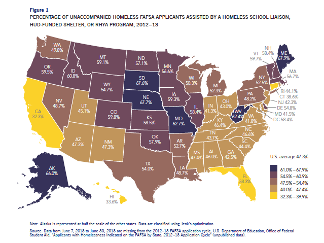 U.S. Department of Education, Office of Federal Student Aid, “Applicants with Homelessness Indicated on the FAFSA by State: 2012–13 Application Cycle” (unpublished data) ■ Federal Reserve Bank of San Francisco, “Is It Still Worth Going to College?,” www.frbsf.org ■ College Cost Reduction and Access Act, Public Law 110–84, U.S. Code 20 (2007), § 1001 ■ U.S. Department of Education, Application and Verification Guide [2014–15 Federal Student Aid Handbook], April 2014 ■ Institute for Children, Poverty, and Homelessness, The American Almanac of Family Homelessness, April 2013 ■ National Association for the Education of Homeless Children and Youth, Financial Aid for Unaccompanied Homeless Youth: A Survey Report, 2014 ■ Higher Education Access and Success for Homeless and Foster Youth Act of 2013, S 1754, 113th Cong. 1st sess.