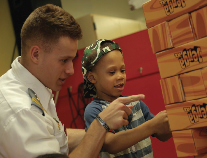 More than 40 children and some parents gathered in the recreation room at the Saratoga to play games like Connect 4, Stratego, Uno, Battleship, and life-sized Jenga with the cadets, who wore their Army White Uniform, one of the Army’s dress uniforms. “That was super impressive to the kids,” says Pace.