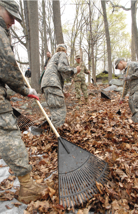The camps are only in session during the summer months, therefore every spring HFH seeks out volunteers to assist in an exhaustive cleanup of the debris that gathered during the winter months. “It is brutal, hard, hot work with bugs,” says Pace. “It involves clearing out the leaves and picking up the ‘winter’ from the campsites.” In her search for dedicated volunteers, Pace contacted the volunteer coordinator at West Point.
