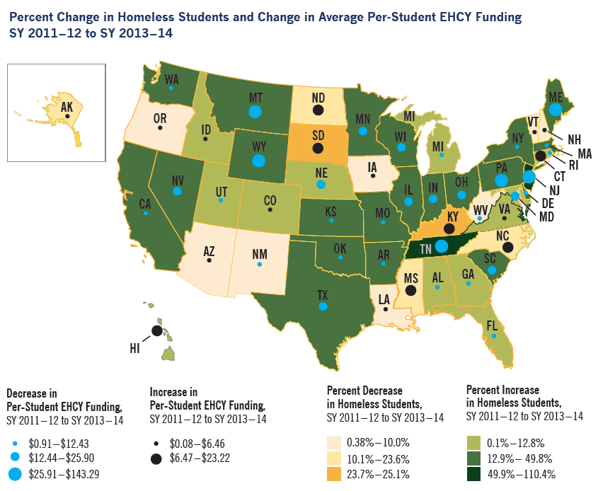 The combination of rising homelessness and flat funding means that the amount of money being spent averages to less than $50 per homeless student nationwide. Of course, states do not all receive the same amount of funding from the federal government, and there is wide variation in how much each state receives per homeless student. As seen in the map (below), 37 states saw an increase in their number of homeless students between SY 2011–12 and SY 2013–14, and all but five of these had a net decrease in per-pupil funding as a result. For example, in Tennessee the number of homeless students more than doubled across those two years, to just under 30,000 students. At the same time, the state saw its total EHCY grant decrease by almost $29,000, resulting in it having $45 less to spend per homeless student compared to SY 2011–12.