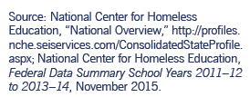 National Association for the Education of Homeless Children and Youth, The McKinney-Vento Act as amended by the Every Student Succeeds Act of 2015, May 2016 ■ National Center for Homeless Education, Federal Data Summary School Years 2011–12 to 2013–14. November 2015 ■ Institute for Children, Poverty, and Homelessness, Aftershocks: The Lasting Impact of Homelessness on Student Achievement. February 2016 ■ U.S. Department of Education, Report to the President and Congress on the Implementation of the Education for Homeless Children and Youth Program under the McKinney-Vento Homeless Assistance Act ■ Institute for Children, Poverty, and Homelessness, The Atlas of Student Homelessness in New York City, August 2015.