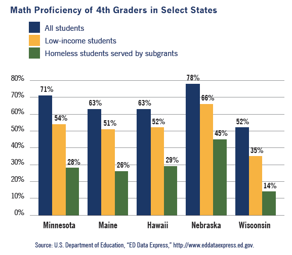 Improving the reporting of homeless students’ academic performance is important due to the wide variation in the achievement gap seen across states. The figure (above) shows the five states with the biggest difference in how homeless students scored on 4th-grade math tests compared to all students. In Minnesota, only 28% of homeless students in areas served by EHCY scored at proficient or above, well below the 71% rate for all students. In many states, the performance of homeless students also lagged behind that of low-income students, despite homeless students being included in the latter group. The gap may be even greater in other states who used the 2013–14 school year to field-test new exams and thus reported unreliable results for the most recent year.