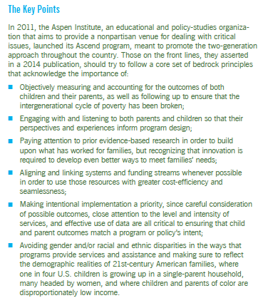 Organizations across the country are beginning to see the wisdom of taking a two-generation approach. Many are members of the Aspen Institute’s growing Ascend Network (see sidebar), which serves as a hub for breakthrough ideas and collaborations that move children and their parents toward educational success and economic security.