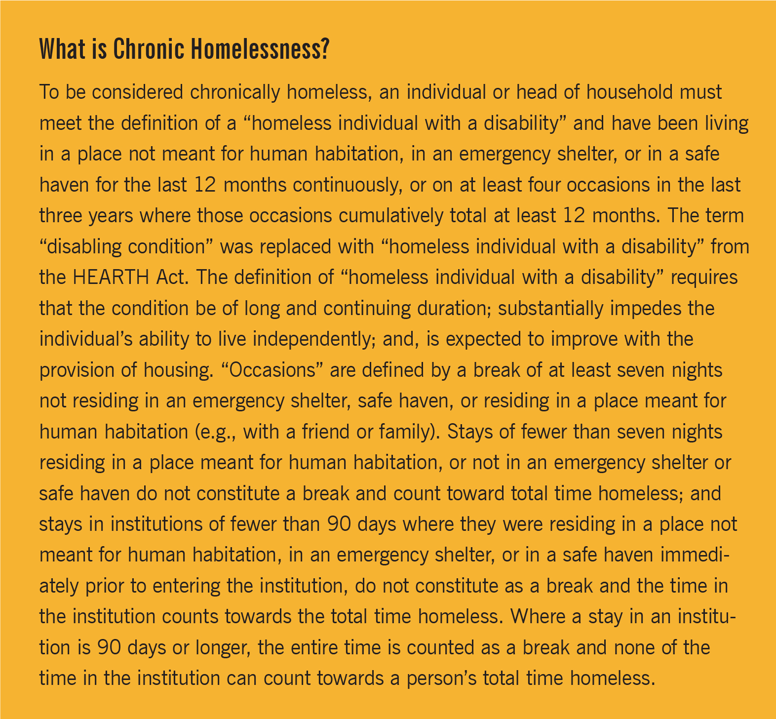 The problems with the chronic homelessness priority begin with how chronic homelessness is defined. What is meant by “chronically homeless?” HUD now considers an individual or head of household to be chronically homeless only if he or she meets the definition of a “homeless individual with a disability” and has been living in a place not meant for human habitation, in an emergency shelter, or in a safe haven for the last 12 months continuously, or on at least four occasions in the last three years where those occasions cumulatively total at least 12 months. Last year HUD promulgated regulations to further restrict the definition of what constitutes chronic homelessness, adding layers to an already complex definition (see the detailed definition, sidebar, page 25). The narrowness of this definition excludes many homeless single adults, and even more parents and children.