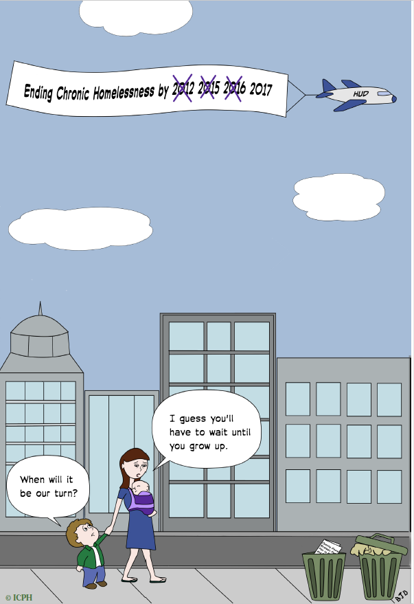 The Obama Administration’s strategic federal plan on homelessness, “Opening Doors,” established the national goal of ending chronic and veteran homelessness by 2015. That goal, which extended the (George W.) Bush Administration’s target of ending chronic homelessness by 2012, has since been pushed back two more times, to 2016 and then 2017—despite the fact that the federal government has focused its energy and funding overwhelmingly on chronically homeless adults since 2004.