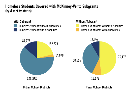 The importance of rural districts receiving adequate funding to support homeless students becomes even clearer when the data is broken down by a student’s disability status. Homeless students are more likely to have developmental delays and other learning impairments than their housed peers, and are entitled to special education services under the Individuals with Disabilities Education Improvement Act (IDEA). Although IDEA provides its own dedicated funding stream to states, the federal contribution made up only 16% of the total cost of the program in FY13, meaning that many states and school districts are underfunded and thus may be unable to provide services to which students with learning disabilities are legally entitled.