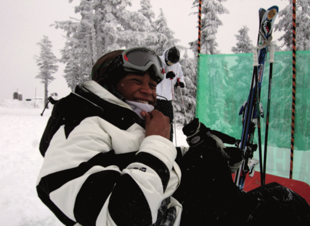 A participant of SOS Outreach’s SnowCore program enjoys a day skiing at Snoqualmie Summit in Snoqualmie, Washington. SnowCore is an exposure program that provides underserved youth with one- or two-day ski or snowboard trips.