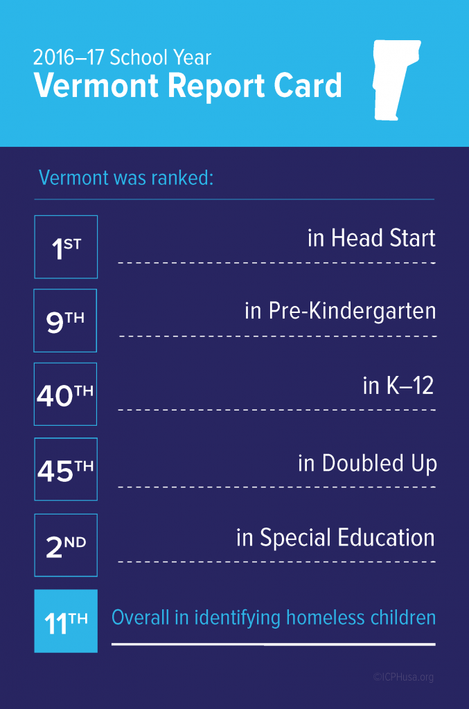 Vermont identified 1,097 homeless students in SY 2016–17. Homeless students made up 1.2% of total enrollment. The state was ranked 11th overall in identifying homeless students, improving from SY 2013–14 when Vermont was ranked 18th in identification.