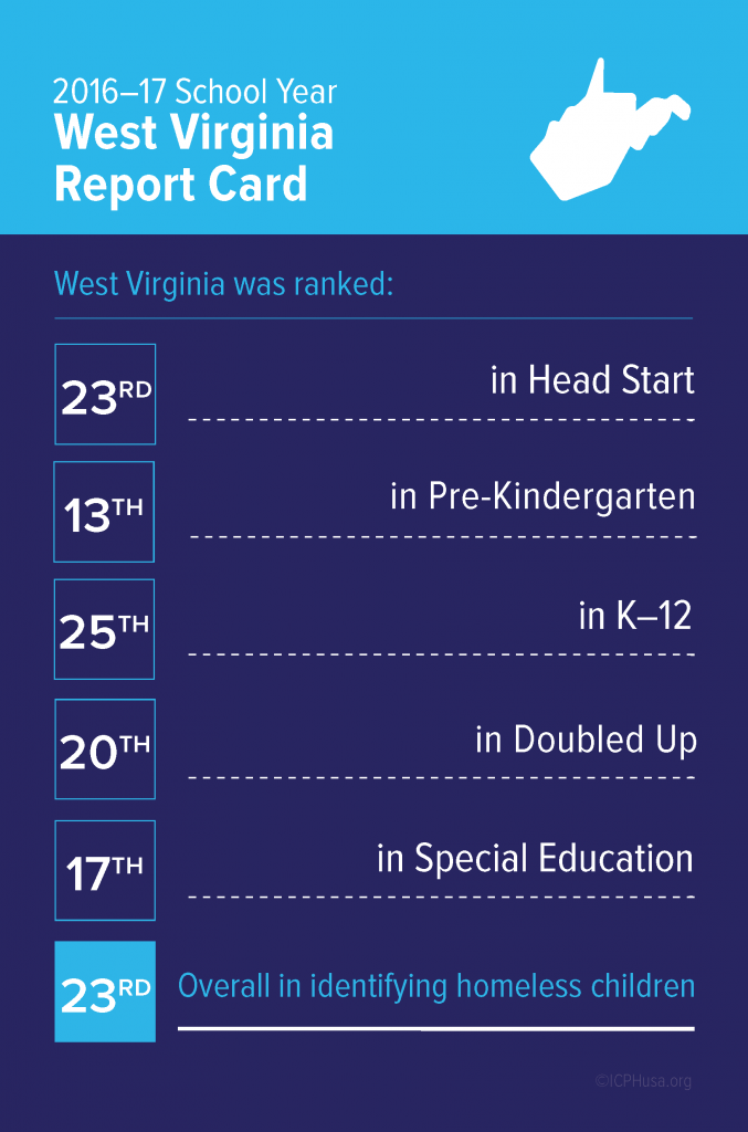 West Virginia identified 9,024 homeless students in SY 2016–17. Homeless students made up 3.3% of total enrollment. The state was ranked 23rd overall in identifying homeless students, dropping from SY 2013–14 when West Virginia was ranked 22nd in identification.